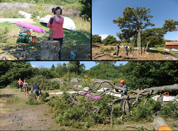 25 juli. Några orkade upp till bastubygget. Nu var det dags att kapa en del av den stora alen.